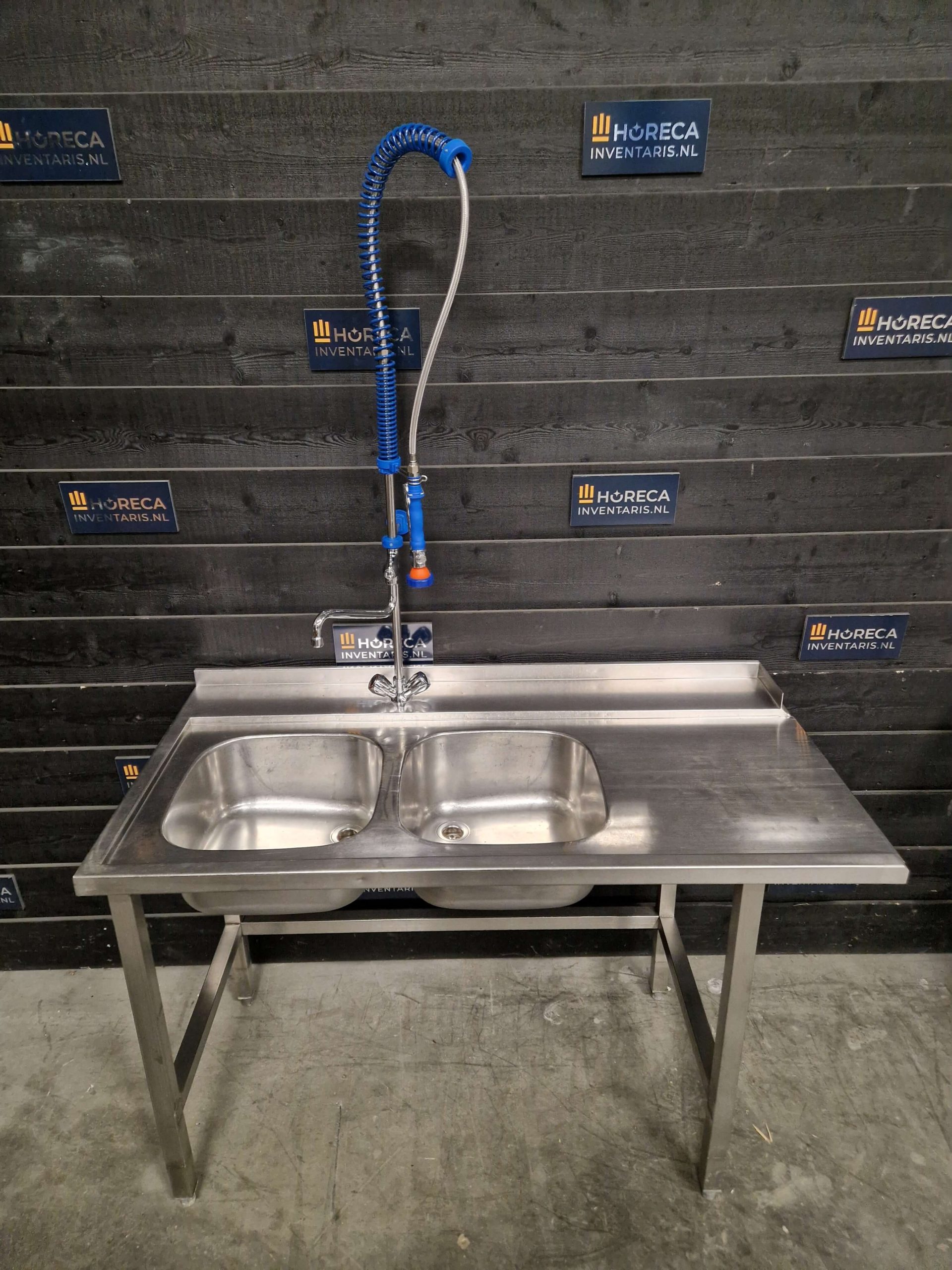 De tafel is praktisch ingedeeld met een ruime linker- en rechterwerktafel en twee diepe spoelbakken, waardoor een soepele werkstroom wordt gegarandeerd. Het duurzame RVS-materiaal is niet alleen sterk en slijtvast, maar ook eenvoudig schoon te maken en bestand tegen intensief dagelijks gebruik.