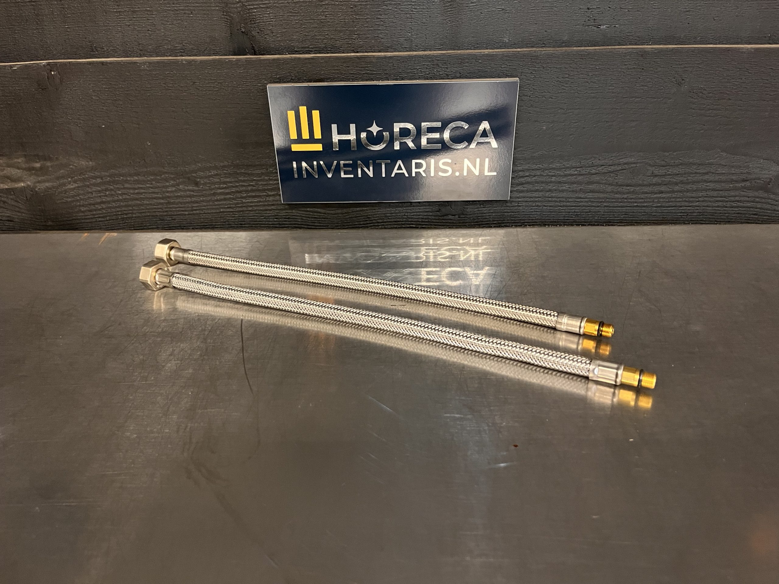 RVS flexibele waterslang van 40 cm voor aansluiting direct in de kraan en op de waterleiding. Aansluiting 1x 3/8″ buitendraad en 1x 1/2″ binnendraad.