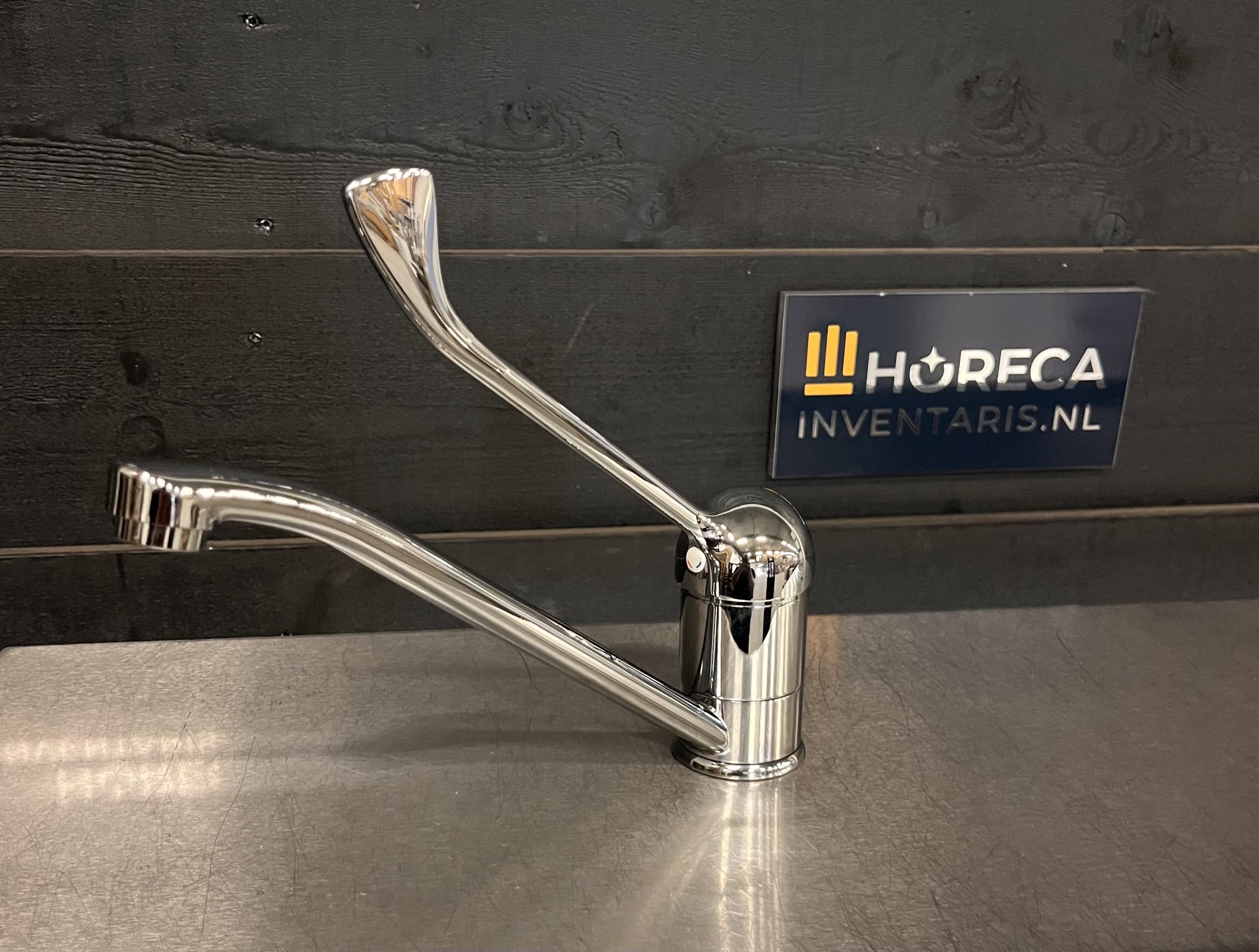 Horeca mengkraan met elleboogbediening en draaibare uitloop. Ideaal voor montage op een RVS wastafel. Wordt geleverd met de benodigde bevestigingsmaterialen en 2 slangen voor aansluiting op de warme en koude waterleiding.