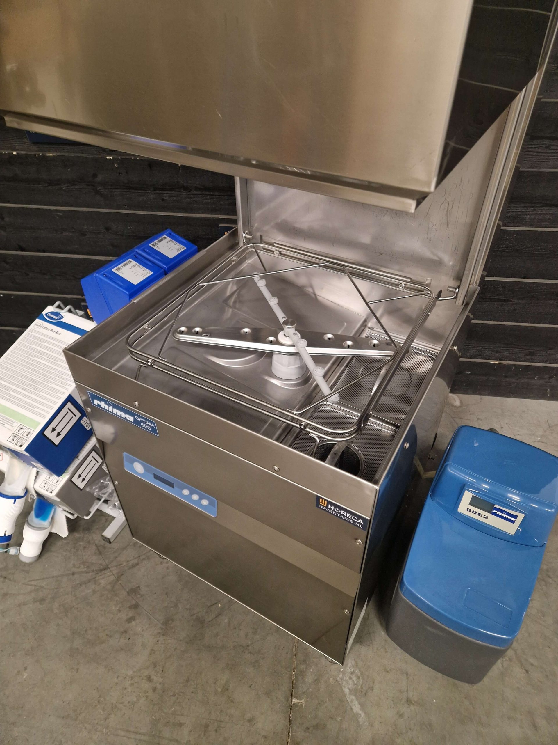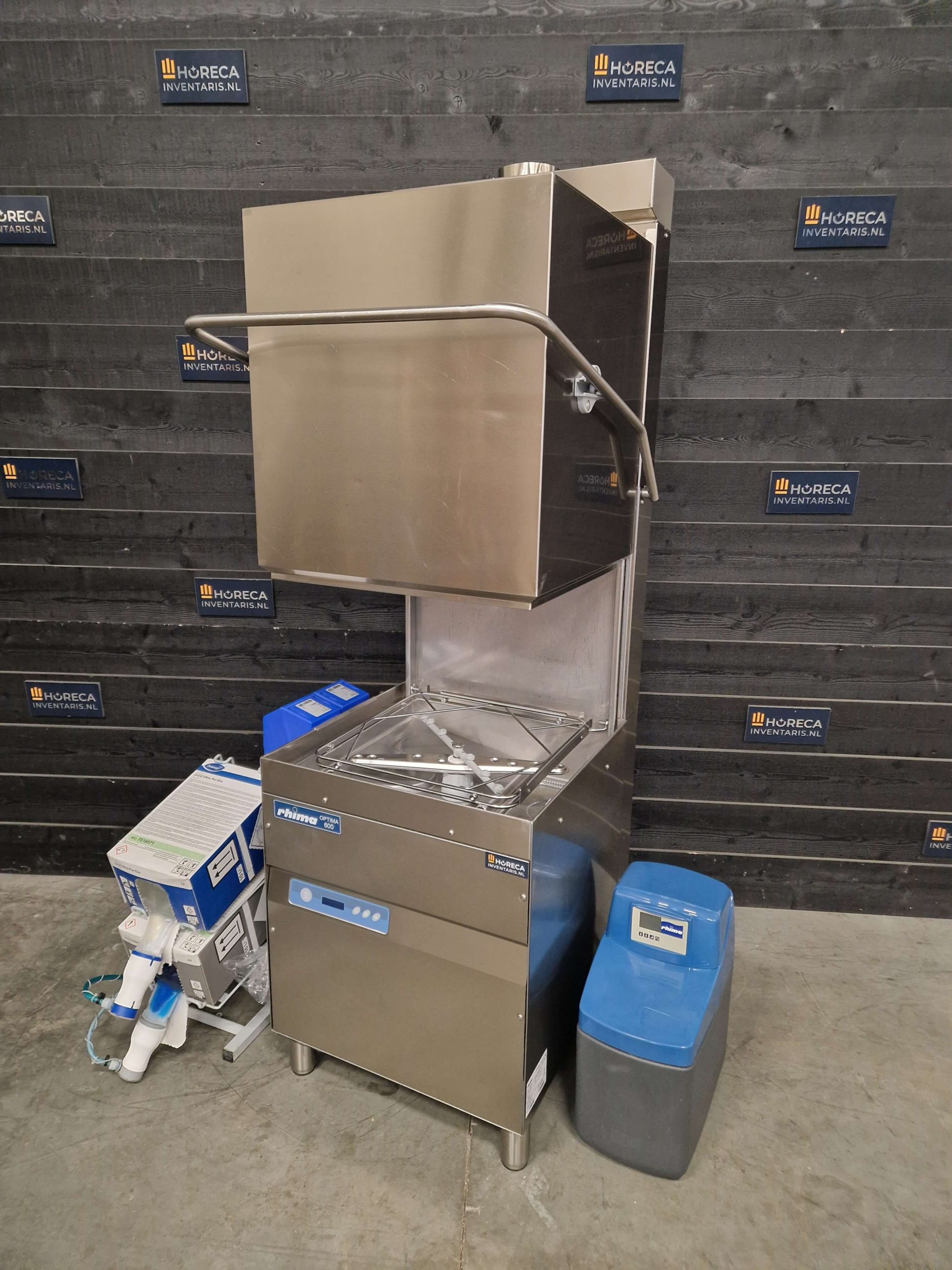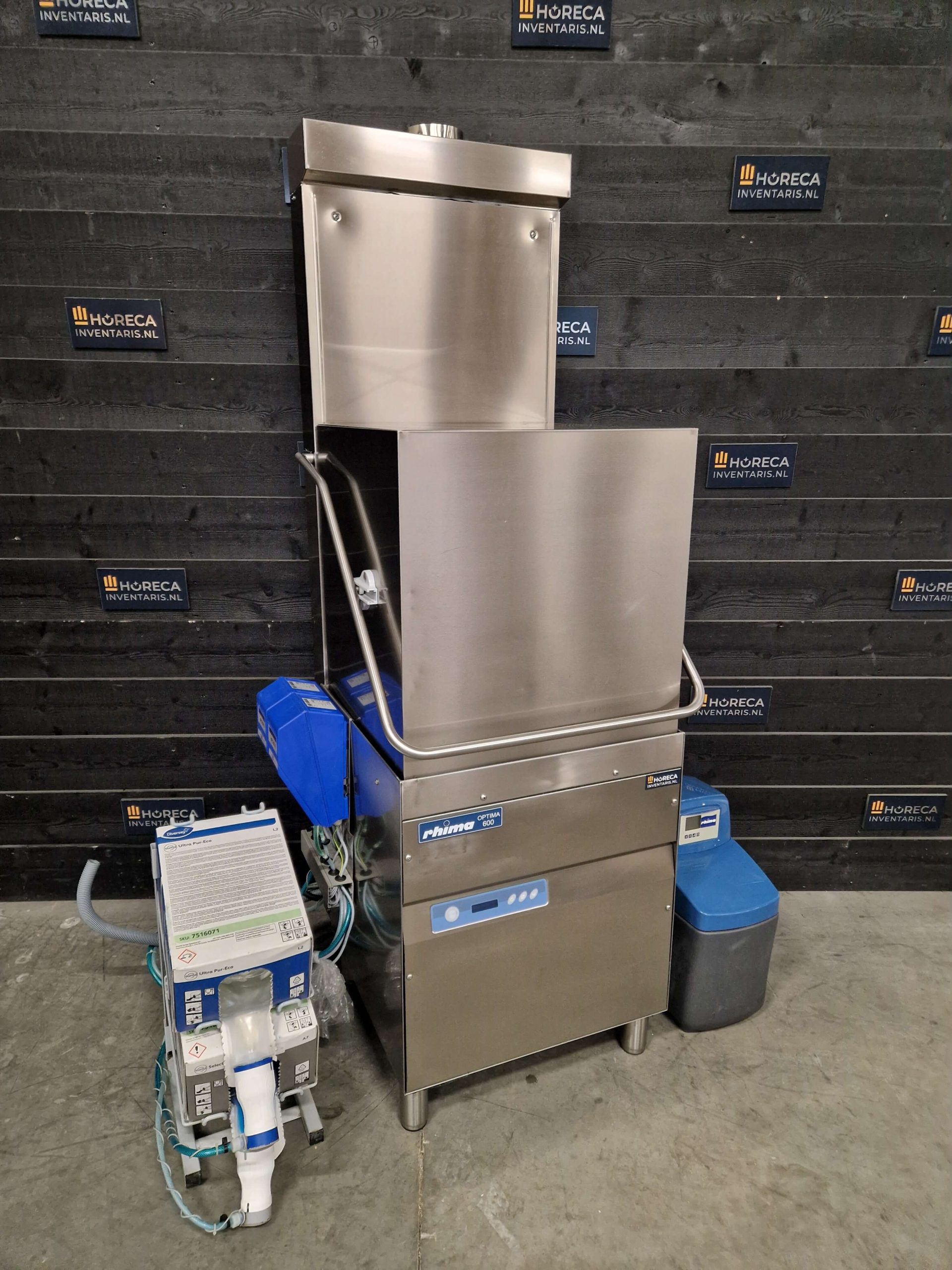 Voor optimaal gebruiksgemak wordt de doorschuifvaatwasser geleverd met een Diversey zeepsysteem en een Rhima waterontharder (type Rhima 10). De waterontharder zorgt ervoor dat kalkaanslag wordt voorkomen en de machine langer in optimale conditie blijft. Daarnaast is de machine voorzien van een afvoerpomp, waardoor het afvoeren van water probleemloos verloopt.