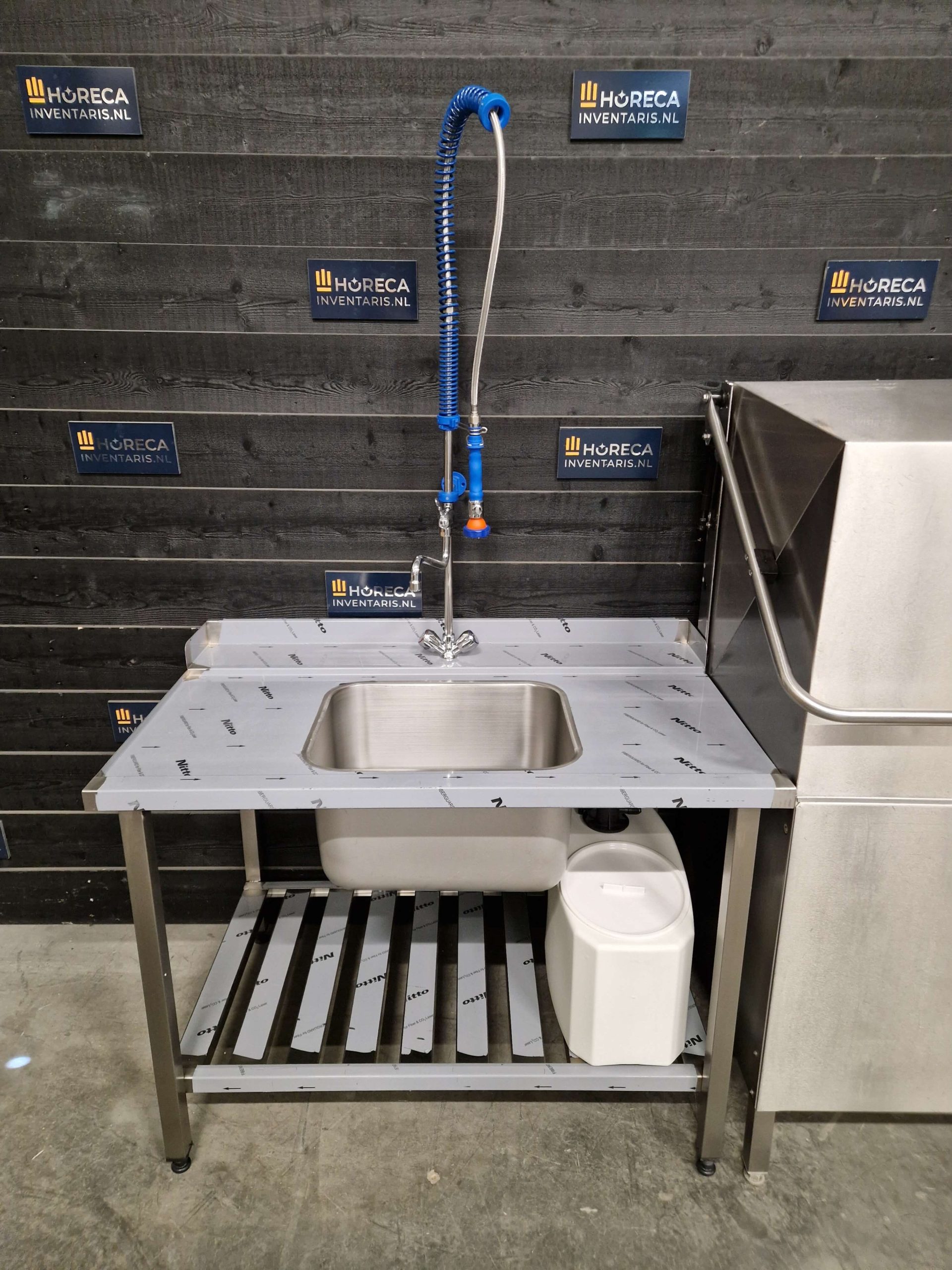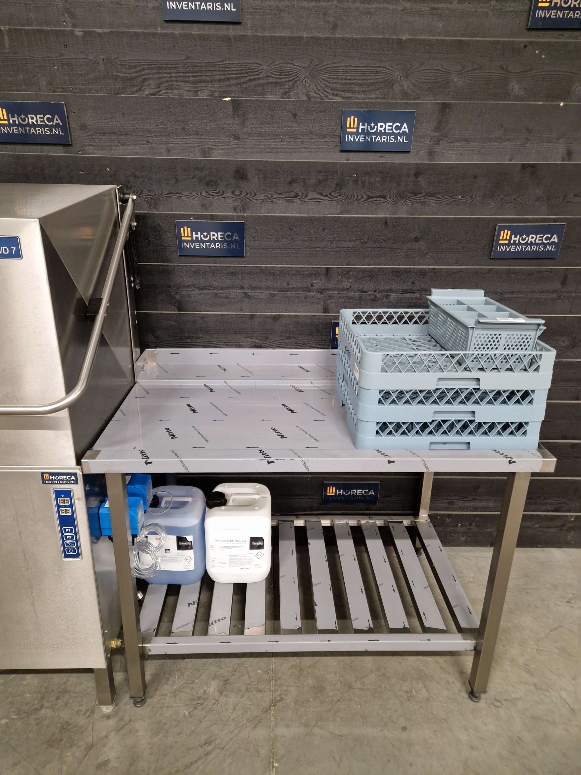 De set wordt compleet gemaakt met een RVS aanvoertafel en afvoertafel inclusief spoelkraan van Fricosmos. Beide tafels hebben een afmeting van 120 x 70 x 90 cm en kunnen flexibel worden geplaatst, waarbij de spoelbak zowel links als rechts gemonteerd kan worden.