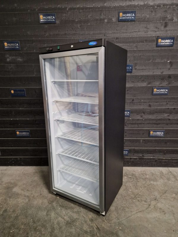 Deze professionele vriezer met een bruto capaciteit van 600 liter (netto 608 liter) is ideaal voor het bewaren van diepvriesproducten in horecakeukens, bakkerijen of andere professionele omgevingen. Dankzij zijn compacte ontwerp past deze zwarte vriezer naadloos in de meeste keukens. De vriezer is uitgerust met zes vaste roosters die voldoende opslagruimte bieden en zorgen voor een goede ventilatie. De glazen deur met slot maakt het mogelijk om de inhoud te bekijken zonder de vriezer te openen, wat energie bespaart en de temperatuur stabiel houdt.