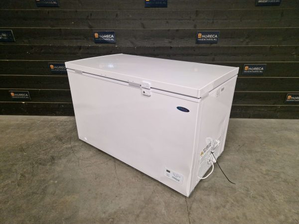 Deze vrieskist is voorzien van zes wieltjes voor gemakkelijk verplaatsen, LED-verlichting in de deksel, een slot voor extra veiligheid en een vochtafvoer. De buitenzijde is wit gecoat metaal, de binnenzijde volledig van aluminium.