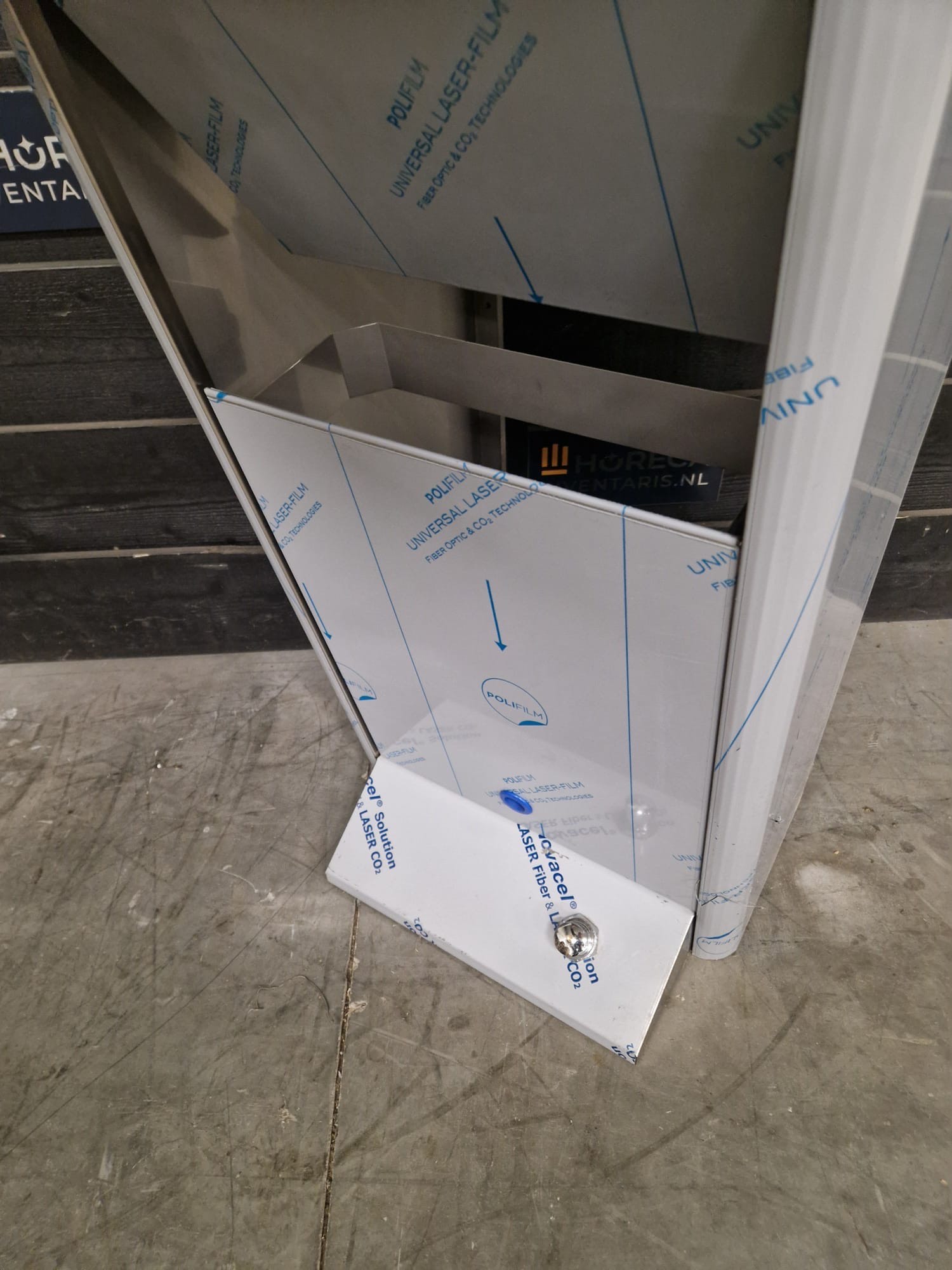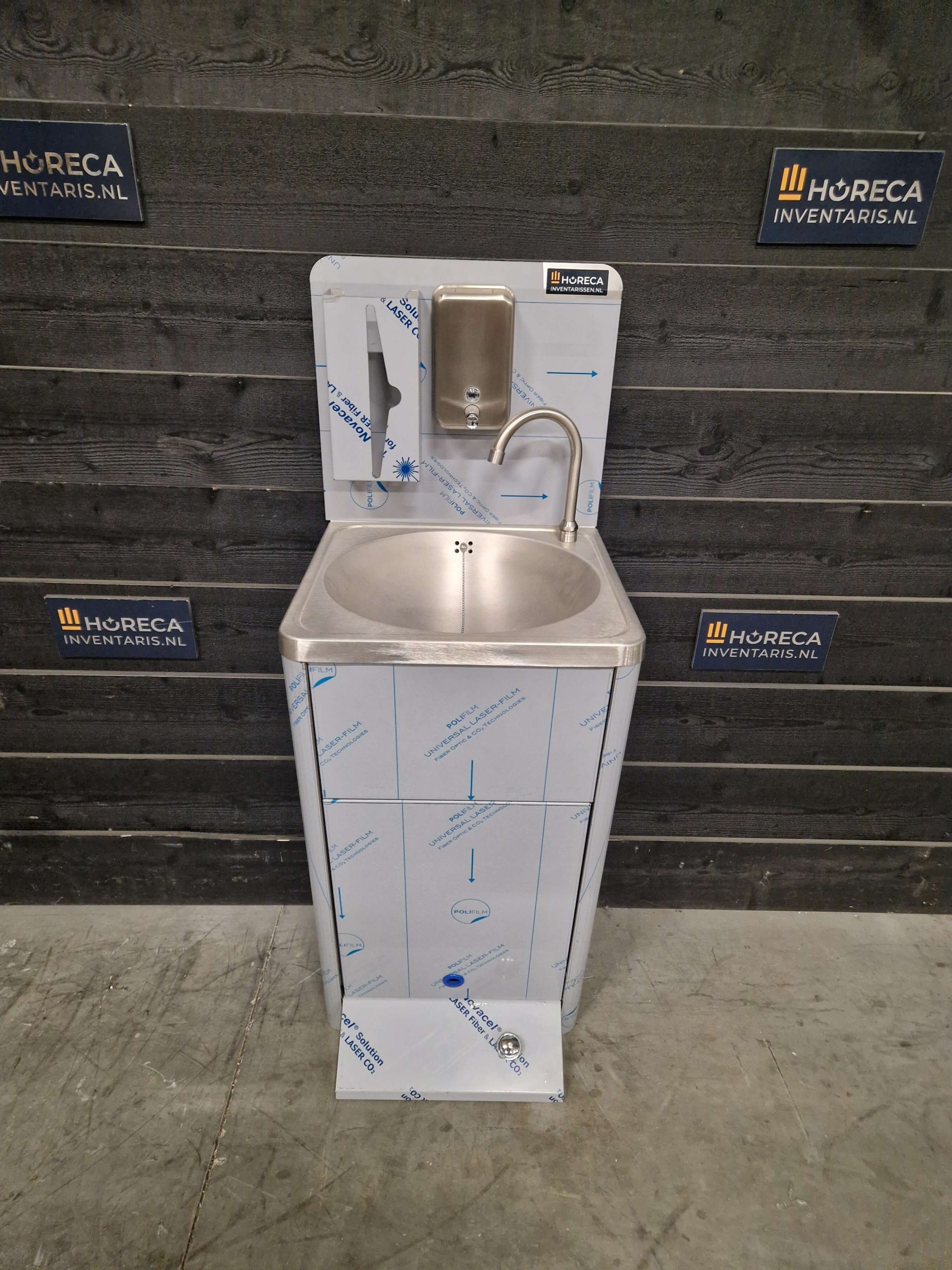 Staande RVS wasbak met voetbediening voor de kraan, afgeronde hoeken en anti lek rand. Bovendien voorzien van geïntegreerde afvalbak, 1L zeepdispenser en handdoekjes houder. De wasbak dient aan de wand bevestigd te worden.